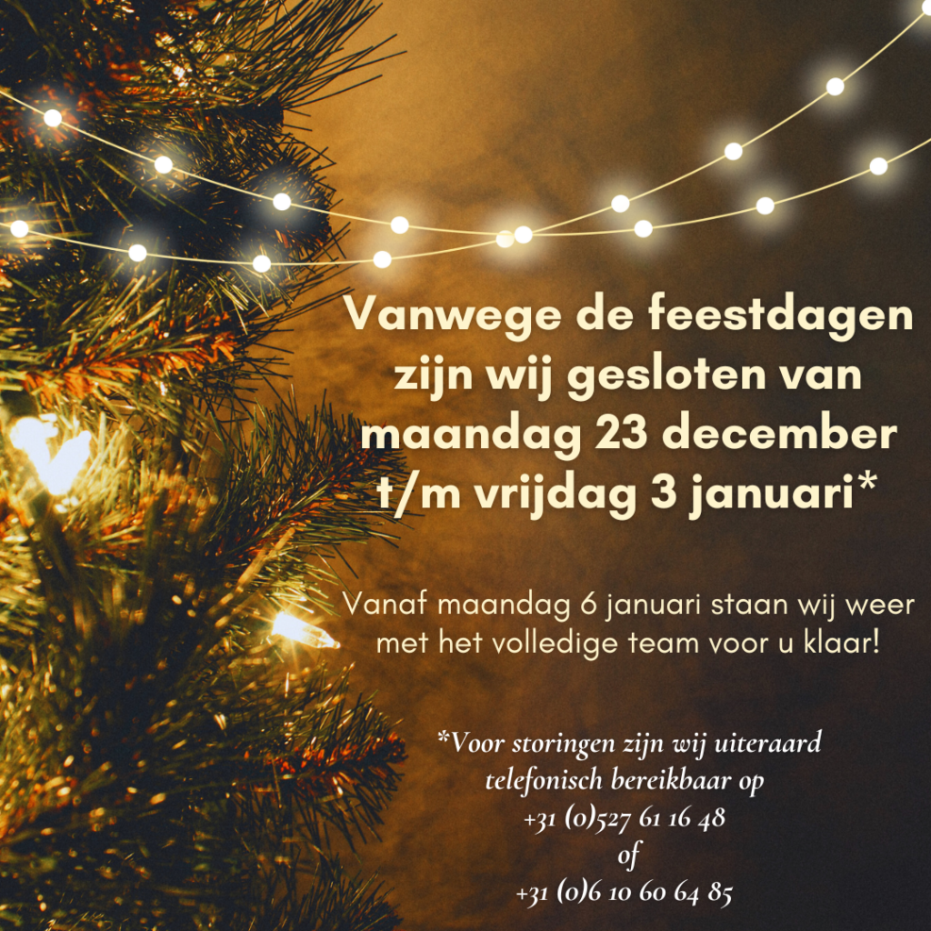 Vanaf aankomende maandag zijn wij 2 weken gesloten ivm de feestdagen.