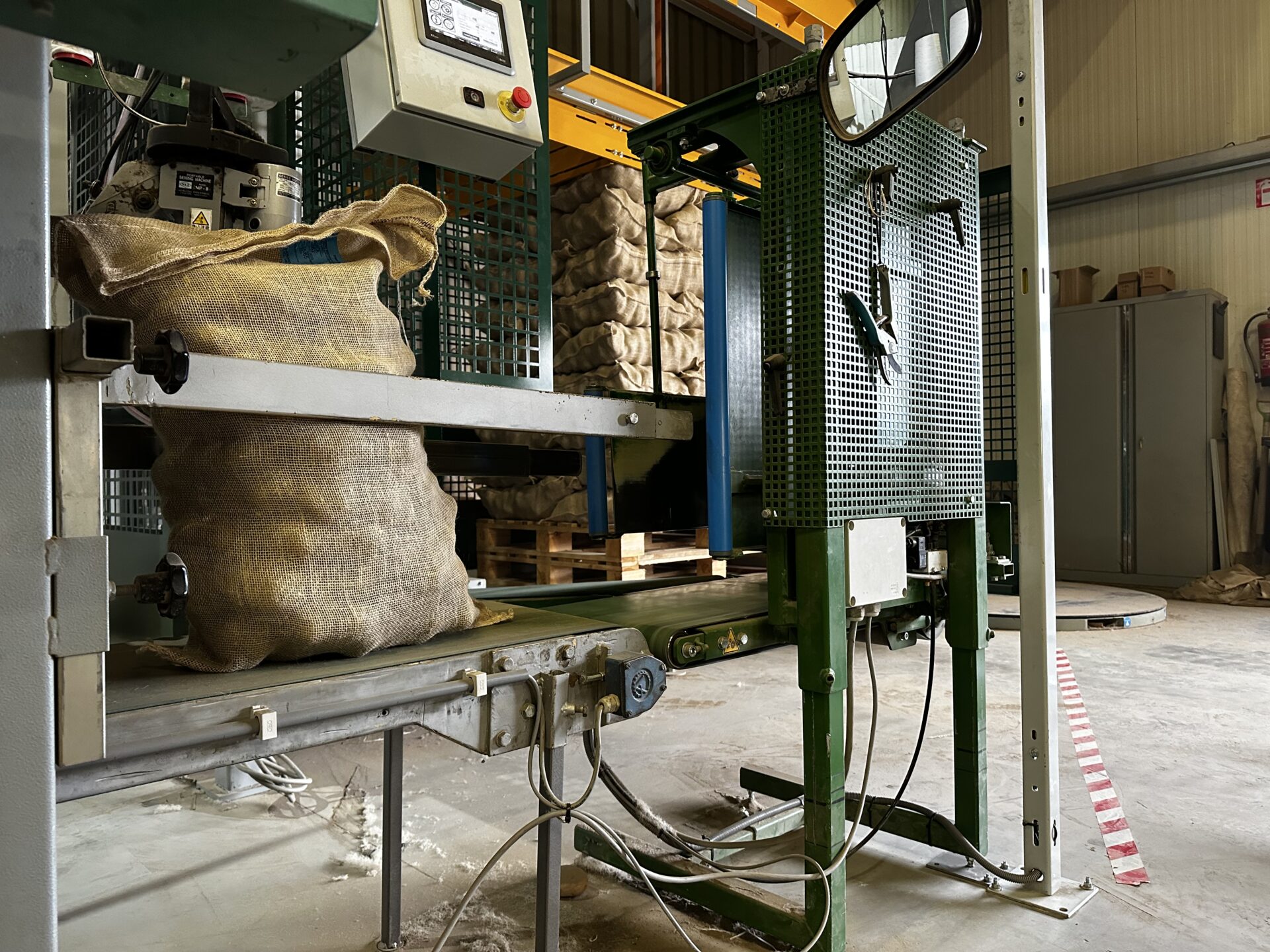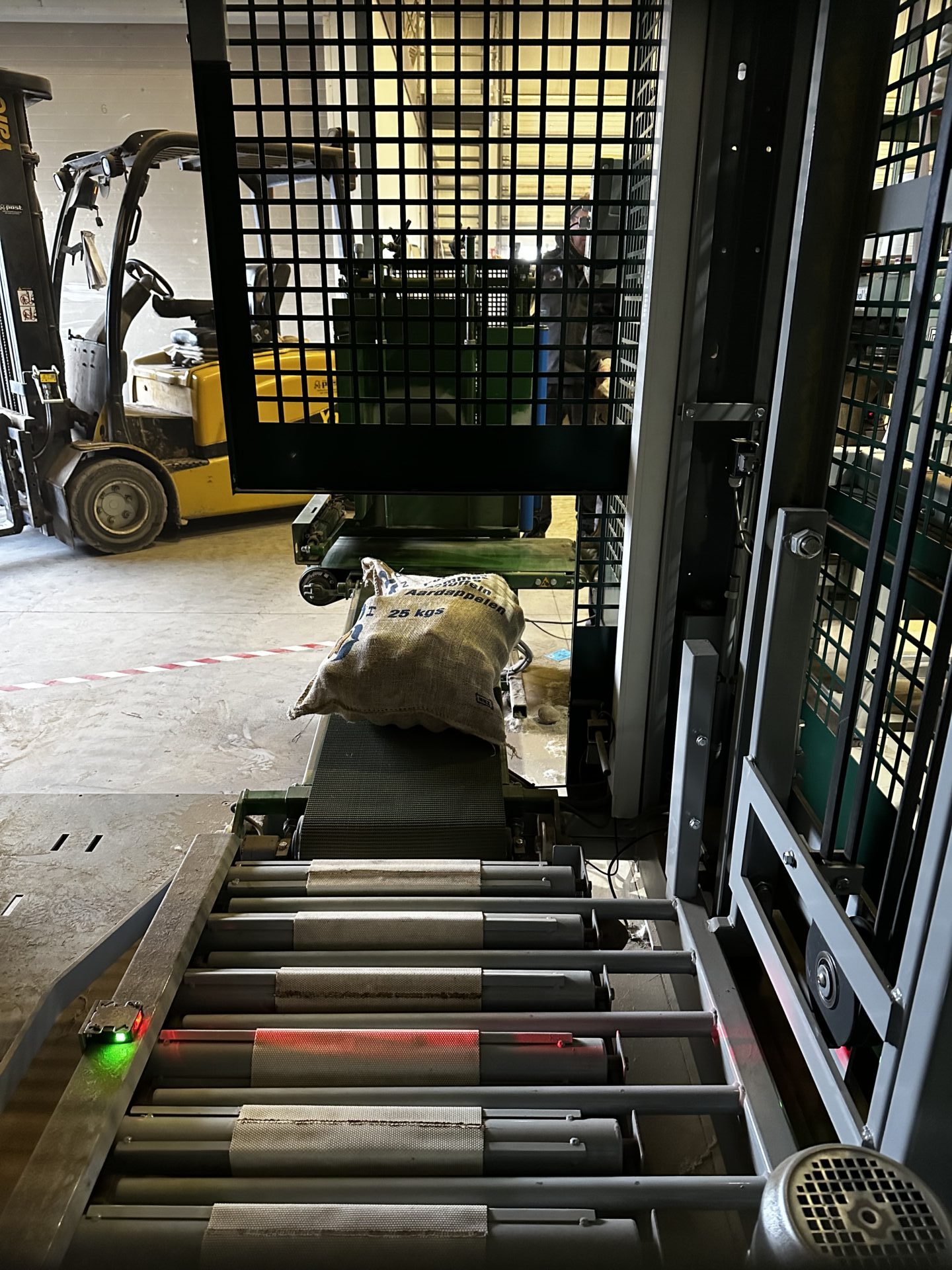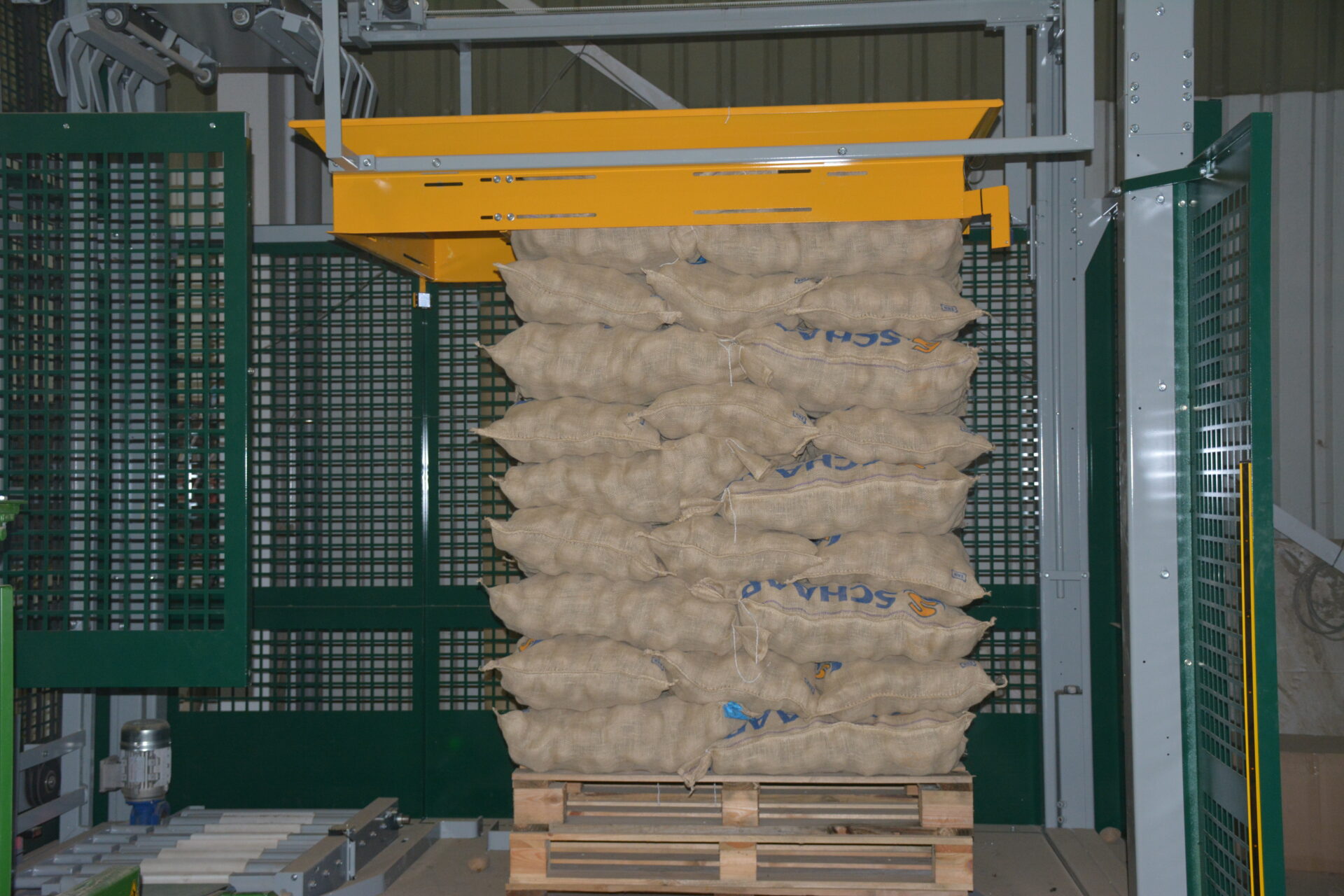 Deze Agrar Systems palletiseermachine is op maat gemaakt met een dubbele weger van Agrar Systems en een gereviseerde naaistraat met afduwer. De palletiseermachine is volledig naar wens van de klant uitgevoerd in een verhoogde opstelling, voor een palletvoorraad en eventuele uitbreiding met een rollenbaan. Deze klant heeft hier bewust voor gekozen, omdat hij in de toekomst dit nog zal uitbreiden met een rollenbaan rechts voor een directe toevoer naar de palletwikkelaar van Agrar Systems.
