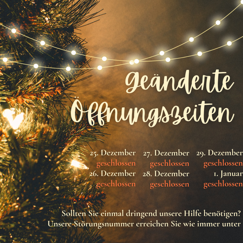 Die Feiertage stehen wieder vor der Tür und das bedeutet, dass wir unsere Öffnungszeiten geändert haben. Über Weihnachten und die Tage zwischen Weihnachten und Neujahr sind wir geschlossen. Ab dem 2. Januar sind wir wieder für Sie da.