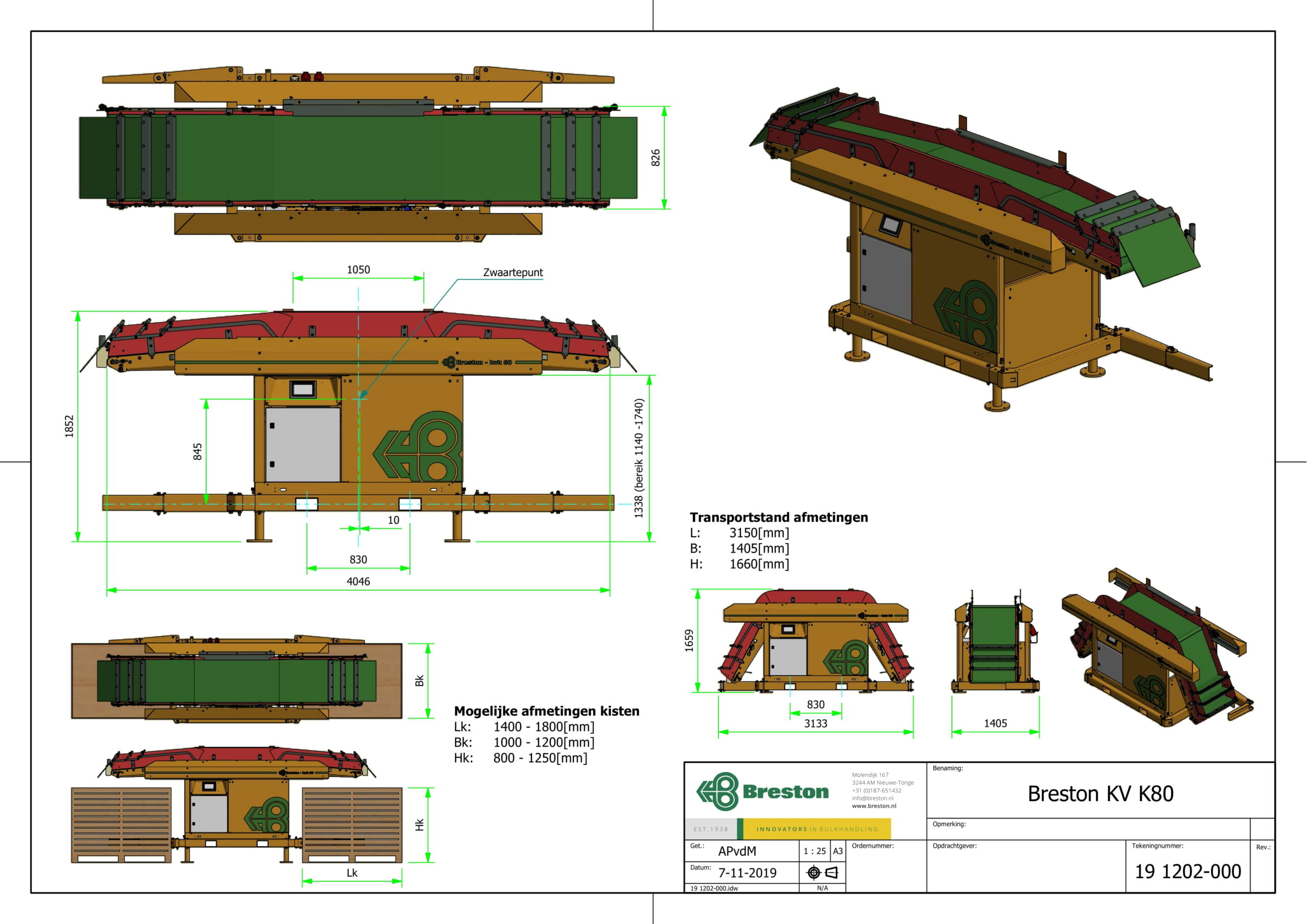 Met de Breston kistenvullers zijn de kisten met een hoge capaciteit gelijkmatig vlak af te vullen. De kistenvuller is geschikt voor diverse kistmaten. Door de linksom en rechtsom draaiende en schuifbare toevoerband zijn kuubkisten snel en continu gelijkmatig af te vullen.